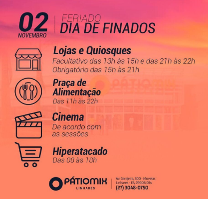 Veja no quadro abaixo como será o funcionamento das lojas, cinema e praça de alimentação no Shopping Patiomix em Linhares.