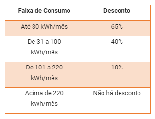 O benefício é aplicado somente a uma unidade consumidora por família e é escalonado por faixa de consumo, sendo calculado conforme a tabela abaixo: