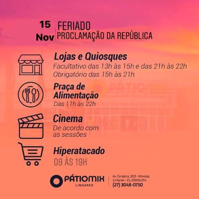 Confira o que abre e o que fecha em Linhares na próxima sexta-feira (15/11):