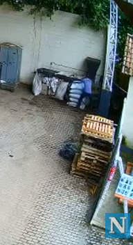 Veja na parte superior, lado direito do vídeo, o momento em que o funcionário pega os sacos de pimenta e joga por cima do muro.
