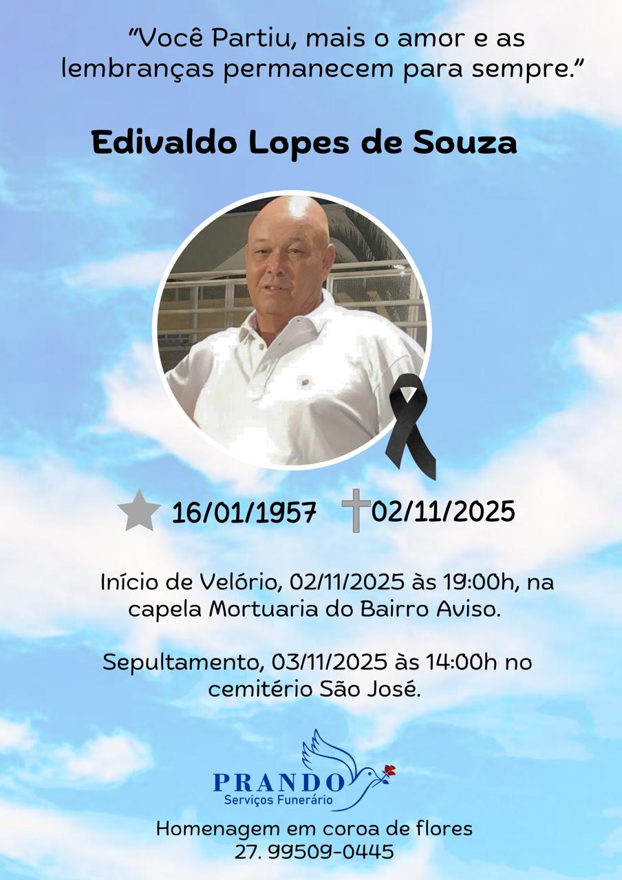 O velório de Edvaldo acontece a partir das 19h deste domingo, na capela mortuária do bairro Aviso, em Linhares. O sepultamento será realizado na segunda-feira (03/11), às 14h, no Cemitério São José, no bairro Interlagos.