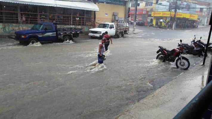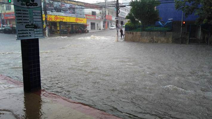 A Rodovia Othovarino Duarte Santos, próximo à UPA 24 Horas, as imagens mostram os veículos transitando em meio a muita água na pista.