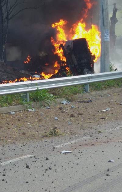 Segundo o Corpo de Bombeiros, o caminhão tombou na pista e logo começou a pegar fogo, derrubando um poste e fios de alta tensão.