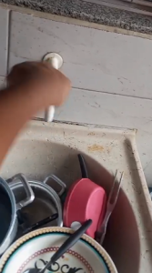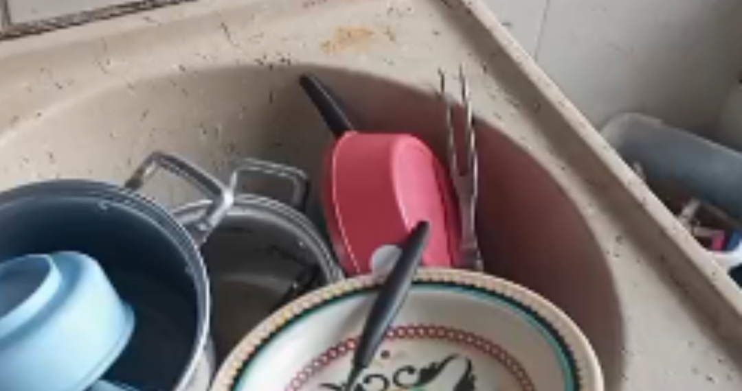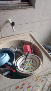 Moradores encaminharam vídeos à reportagem mostrando a situação enfrentada logo no início da manhã. Em um dos registros, uma dona de casa exibe dois tanques completamente cheios de pratos sujos desde a noite anterior, por falta de água desde ontem (30/12).