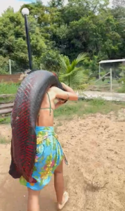 Marcella também fez uma observação sobre a situação da lagoa. Segundo ela, tem sido cada vez mais difícil encontrar peixes no local. Em sua avaliação, a presença do pirarucu — um peixe predador — pode ter contribuído para a diminuição de outras espécies ao longo do tempo.